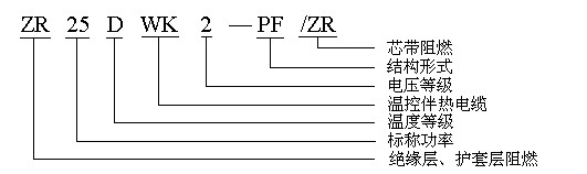 ZR25DWK3-PF 即:阻燃低溫屏蔽防護型,10℃時每米輸出功率為25W,工作電壓為380V,具有阻燃、防護性能。